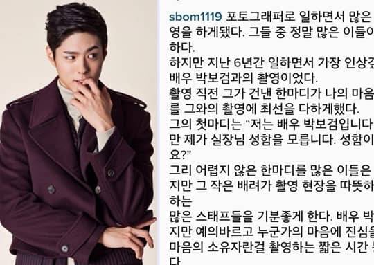 이어 2016년 사진작가 백상현은 자신의 SNS를 통해 "지난 6년간 일하면서 가장 인상 깊었던 촬영은 배우 박보검과의 촬영이었다"며 그의 인성에 대해 언급했습니다.