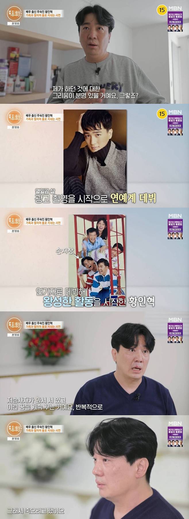 특채 탤런트로 배우가 됐지만, 얼마 지나지 않아 고통이 찾아왔다고. 황인혁은 "25~26년 전인데 자려고 눈 감으면 생각도 안 하고 있는데 장군이 와서 서있고 저승사자가 와서 서있고 미치는 거다. 정신과도 갔었다. 그때 저 죽으려고 했다 너무 괴롭더라. 부모님한테도 죄송하고"라고 말해 안타까움을 자아냈다.