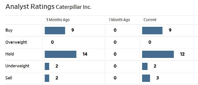한편 월가에서 캐터필러에 대해 투자의견을 제시한 애널리스트는 총 26명으로 이 중 9명(34.5%)만 매수(비중확대 및 시장수익률 상회 등 포함) 의견을 유지하고 있다. 투자의견 컨세서스는 ‘중립(보유)’이다. 평균 목표주가는 369.8달러로 이날 종가보다 6% 낮다.