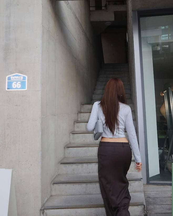 배지연이 선택한 스타일은 군더더기 없이 미니멀하지만 강렬하다. 크롭한 그레이 톱과 차분한 브라운 롱스커트. 노출의 범위는 크지 않지만, 실루엣이 모든 것을 설명한다. 허리를 완전히 드러내는 크롭 디자인은 시선을 자연스럽게 골반 라인으로 이끈다. 그 아래로 매끄럽게 떨어지는 스커트는 몸의 곡선을 따라 흐르며 완벽한 대비를 만든다.