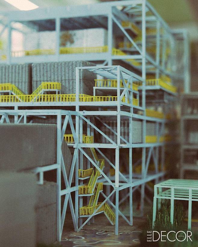 A : 유치원부터 초등학교 때까지 세검정에 있는 아파트에 살았다. 앞뒤로 뜰이 있고 엘리베이터도 없는 5층짜리 건물이었는데, 한 층에 무려 30세대나 거주했다. 몇 호에 누가 사는지 속속들이 알 정도로 이웃과 가까웠고, 긴 복도를 따라 달리기 시합을 했던 순간이 지금도 행복한 기억으로 남아 있다. 브루탈리스트의 건물처럼 모던한 공간에 정겨운 달동네 골목 같은 상황이 연출됐다. 당시 기억을 발판 삼아 고밀도 도시에서 사람들이 모여 사는 방식을 다양하게 탐구했다.