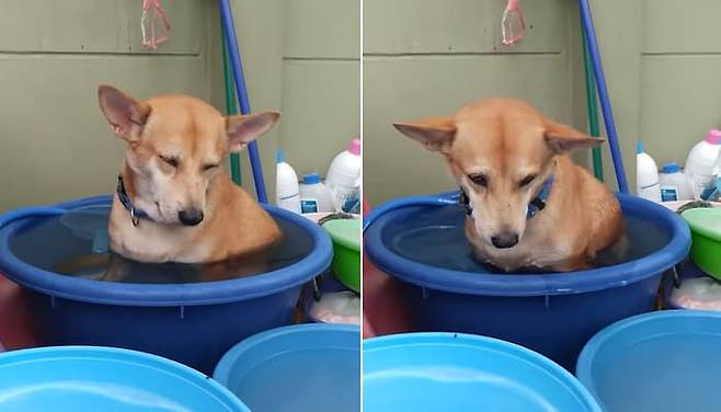 시원한 물에서 반신욕을 즐기는 중이라는데요 ㅎㅎ