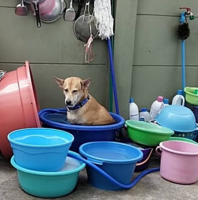 고무 대야에 받아놓은 물속에 풍덩 빠져 있지 않겠어요 ㅋ