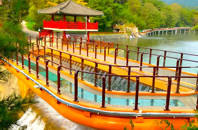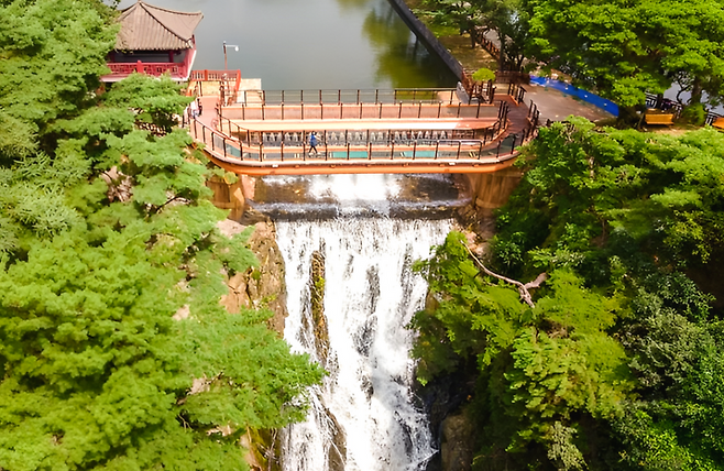 하지만 진짜 매력은 해가 진 뒤에 시작됩니다. 일몰 이후부터 밤 10시까지 이어지는 야간 경관조명과 미디어 파사드 쇼는 용추폭포를 거대한 스크린으로 바꿔놓습니다. 화려한 영상과 빛이 폭포 위로 투사되며, 부서지는 물방울이 보석처럼 반짝이는 장면은 마치 영화 속 한 장면을 보는 듯 환상적입니다.