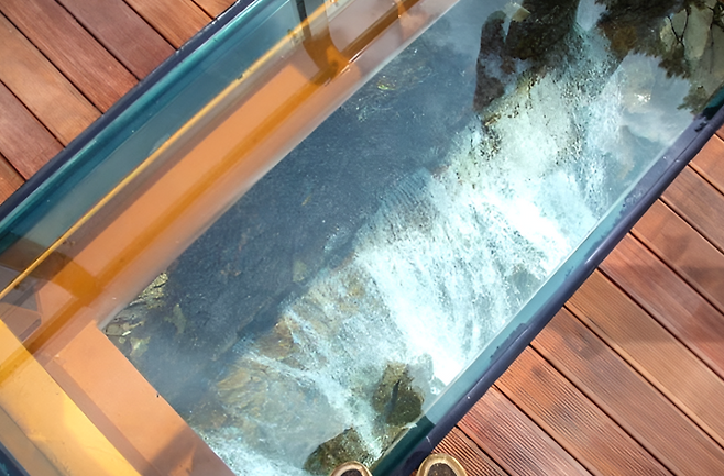 평소에는 불투명한 회색빛 바닥이지만, 사람이 다가서면 센서가 움직임을 감지해 투명하게 바뀝니다. 그 순간 폭포 아래로 쏟아지는 물살이 한눈에 펼쳐지며, 마치 공중 위를 걷는 듯한 아찔함을 선사합니다.