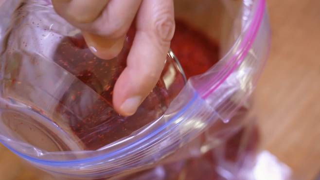 이제 지퍼백에 고춧가루를 계속해서 옮겨 담으세요. 이때! 한 가지 주의해야 할 부분은 너무 꽉 차게 넣지 않는 것이에요. 약 2/3 지점까지 담아 주셔야 해요. 이유는 너무 많이 담을 경우 지퍼가 터지기 쉽고 닫기도 쉽지 않기 때문이랍니다.