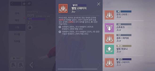 다만, 여기서도 캐릭터의 매력을 살려줄 만한 연출에서는 아쉬움이 보입니다. 전반적으로 화려하고 퀄리티도 높지만, 좀 더 디테일을 살려주면 하는 부분이 보였으니까요. 대표적으로 이벤트를 통해 추가 코스튬을 제공하는 아이돌 콘셉트의 정령 '미카'와 '시하'입니다. 이 둘은 세트로 파티에 편성했을 때 메인 스킬과 패시브 스킬, 얼티밋 스킬에 추가 보너스가 생기는 것이 특징입니다.