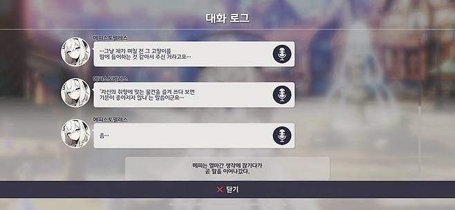 처음에는 캐릭터 별 특징을 살리기 위한 건가 싶기도 했는데, 메피스토펠레스의 인연 스토리를 진행하던 도중 저 방식이 전부 나오는 걸 보고 이건 제대로 마무리가 되지 않은 것이라 확신했습니다. 이 역시 캐릭터의 매력을 저해하는 요인이 됩니다. 캐릭터와 이야기에 집중하고 싶은데, 매끄럽지 못한 대화 진행에 흐름이 끊기니 짜증이 나죠.