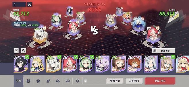 진형의 선택과 정령의 배치, 전투에서의 메인 스킬, 얼티밋 스킬 사용에 신경 쓰면 현재 파티보다 전투력이 높은 스테이지라도 충분히 극복할 수 있었습니다. 특히, 메인 화면의 방주 메뉴의 '레벨 동기화'를 통해 5명의 정령에만 재화를 몰아 육성하면 새로 얻은 정령을 즉시 전력으로 채용할 수 있다는 점도 좋았습니다. 전투에서 활용 가능한 캐릭터 풀을 늘려주고, 클리어하지 못하는 스테이지에서도 좀 더 고민할 거리를 만들어주거든요.