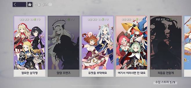 또, 게임에는 미카와 시하 외에도 인연이 되는 정령을 묶어 버프를 주는 '소울 링크'가 있는데요, 이 역시 전투에 함께 편성했을 때 특수 대사가 나온다든지, 연출이 조금씩 변하는 건 없었습니다. 성능이 좋지 않더라도 연출이나 콘셉트가 마음에 들어서 빠져드는 경우도 있는 만큼, 이 부분도 좀 더 신경써줬다면 좋지 않았을까 싶네요. 전투 자체의 재미는 나쁘지 않았으니 말이죠.