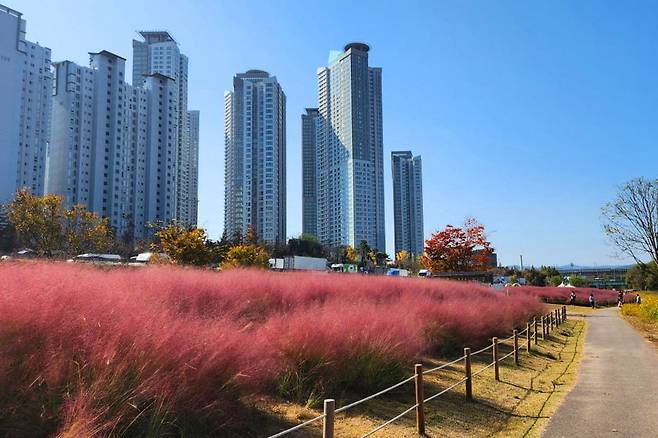 대전 대덕구에 위치한 금강로하스 산호빛공원은 금강을 따라 조성된 산책로가 특징입니다. 가을이면 공원 내 핑크뮬리 군락이 만개하여 방문객들에게 인생 사진을 남길 기회를 제공합니다.