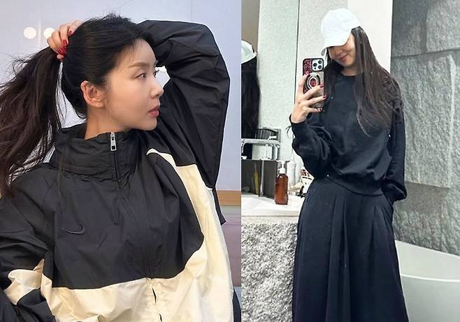 이어진 컷에서는 올블랙 스웻셔츠와 와이드 플리츠스커트에 화이트 볼캡을 매치해 도회적이면서도 흐트러짐 없는 캐주얼 무드를 완성했습니다.