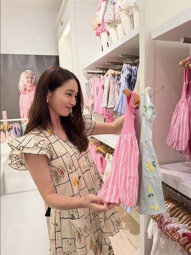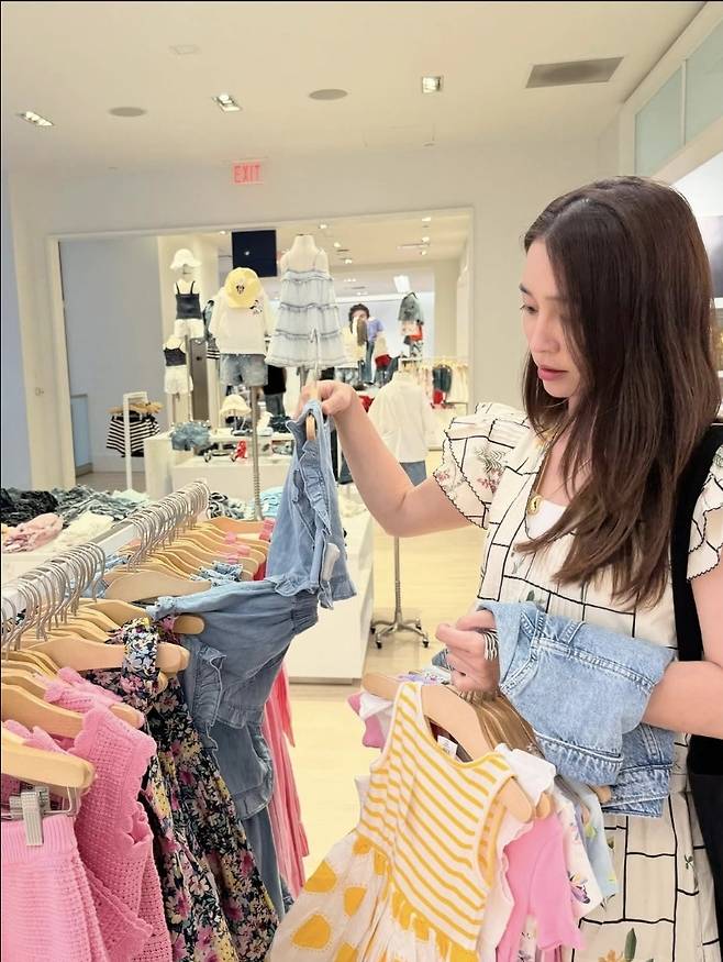 이민정은 화사한 컬러감의 키즈 의류 매장에서 여유로운 미소로 아기 옷을 고르는 모습을 공개했습니다.