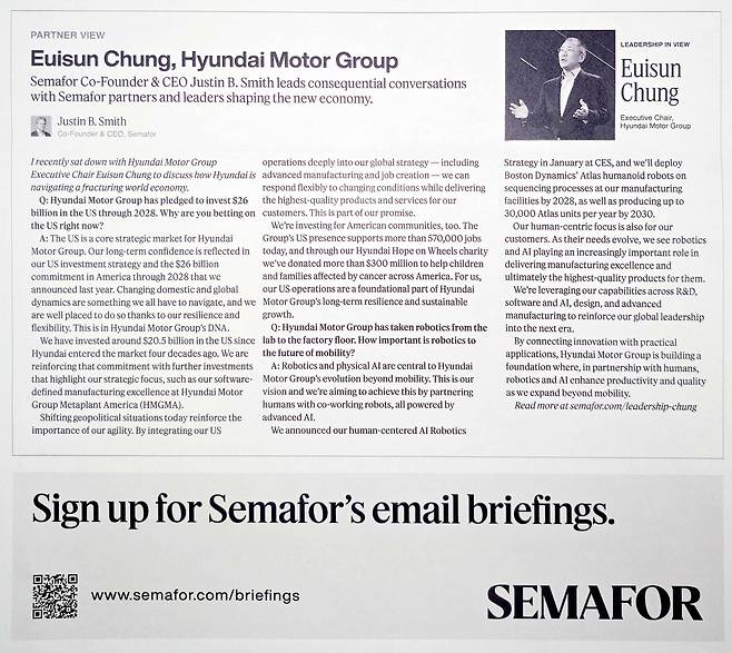 2026 세마포 월드 이코노미 안내용 인쇄물미래 핵심 사업인 로보틱스 분야에 대한 구체적인 청사진도 내놨다. 정 회장은 "2028년까지 제조 시설에 보스턴다이나믹스의 휴머노이드 로봇 '아틀라스'를 배치하겠다"며 "2030년까지 아틀라스를 연간 최대 3만 대 생산할 계획"이라고 설명했다.