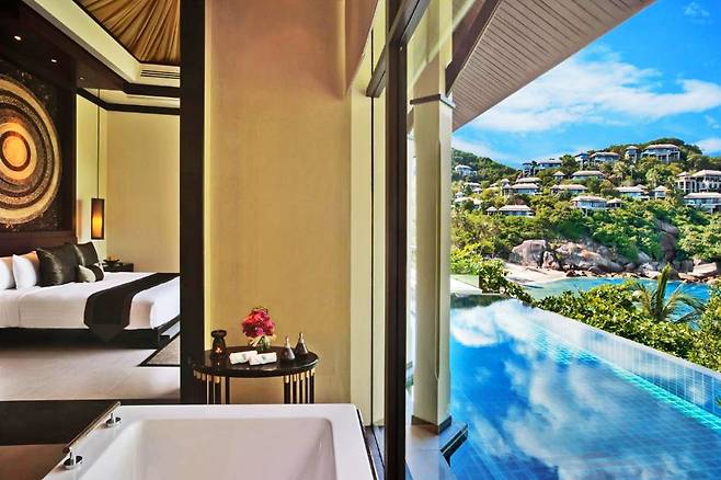 '반얀 트리 사무이 (Banyan Tree Samui)'는 남동부 해안가의 계단식 지형에 자리 잡고 있습니다. 휴양지에 걸맞는 완벽한 위치를 자랑하는데요. 전 객실이 풀빌라로 이루어져 있어 허니무너들에게 인기 있는 코사무이 리조트입니다.