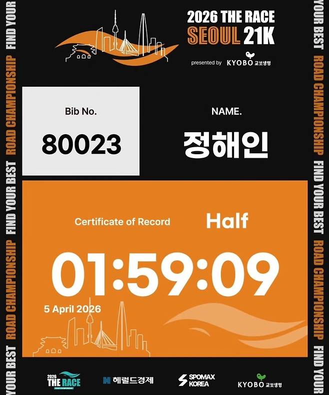 6일 정해인이 직접 공개한 공식 기록증에 따르면, 그의 최종 기록은 01:59:09다. 이는 하프 마라톤 첫 도전임에도 불구하고 km당 약 5분 38초의 일정한 페이스를 유지해야 도달할 수 있는 준수한 기록이다.