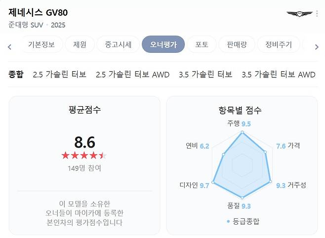 실제 차량 소유주들의 차량 평가 데이터를 취합한 네이버 마이카 오너평가에 따르면 제네시스 GV80의 오너평가 평균 점수는 8.6점을 기록했다. 연비와 가격을 제외한 항목이 9점 이상의 높은 점수를 기록했다.