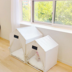 어디에나 잘 어울리는 화이트톤 강아지 하우스입니다. 지붕이 있는 집 모양의 텐트 하우스예요. 캔버스 천으로 되어 있어 튼튼하고 세탁도 가능합니다. 양면 방석으로 여름에는 린넨, 겨울에는 기모 원단으로 사용이 가능해요.