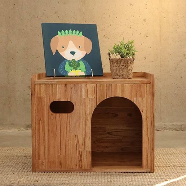 협탁으로 사용 가능한 원목 하우스입니다. 위 두 제품과 비교해 더 진한 색상이에요. 단단한 참죽 원목을 사용해 내구성이 아주 좋습니다. 이 제품도 방석은 별도 구매입니다.