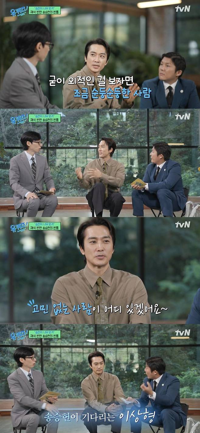 tvN '유 퀴즈 온 더 블럭'(이하 '유퀴즈')에는 송승헌이 게스트로 출연했습니다. MC 유재석은 송승헌에게 "요즘 고민이 있냐"고 물었습니다. 송승헌은 "고민이 없는 사람이 어디 있겠냐"고 답했습니다.