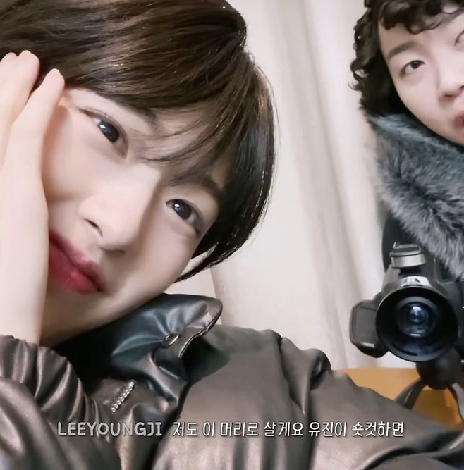 안유진이 고은찬으로 변신했을 당시 이영지는 '꽃보다 남자'의 구준표 헤어스타일을 하고 있는데요. 안유진이 숏컷을 하면 자신도 구준표 머리로 살겠다고 호언장담했었기 때문입니다.