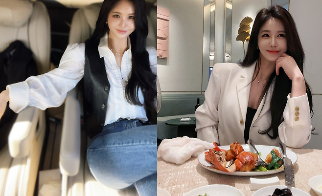 첫 번째 사진에서는 그레이 컬러의 오버사이즈 아우터와 블랙 이너, 그리고 여러 겹의 진주 목걸이로 모던하면서도 여성스러운 분위기를 드러냈다. 자연스러운 미소와 함께 골드 이어링이 세련된 마무리를 더한다