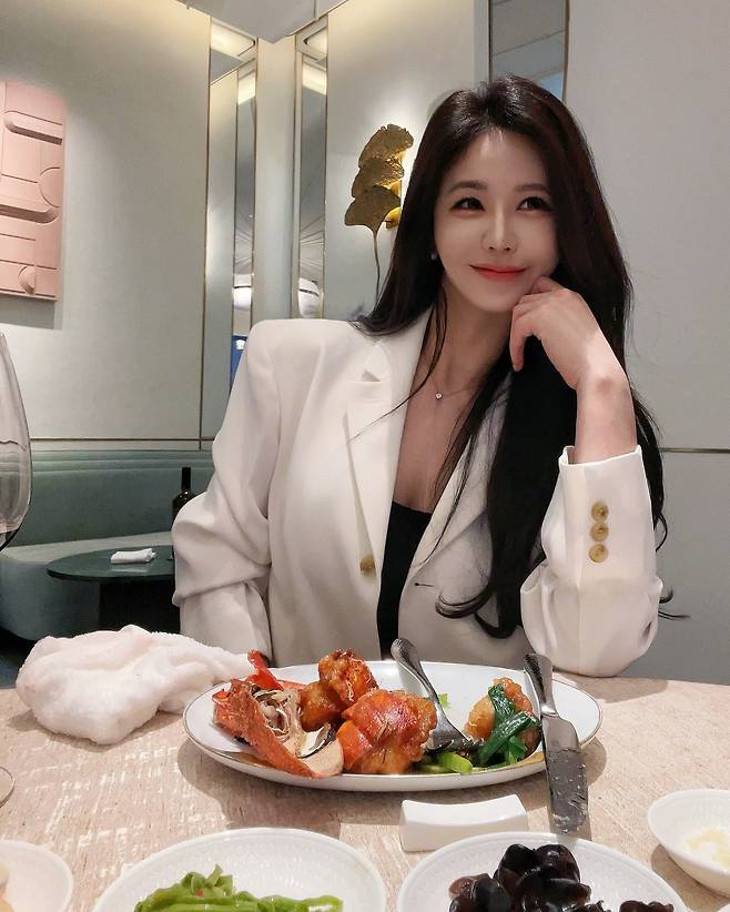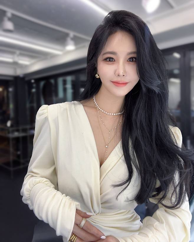 두 번째 사진에서는 아이보리 컬러의 랩 원피스에 진주와 골드 레이어드 네크리스를 착용해 고급스러운 이미지를 강조했다. 볼륨감 있는 헤어스타일과 미소가 어우러져 세련된 오피스룩 혹은 공식 석상에 어울리는 스타일을 완성했다
