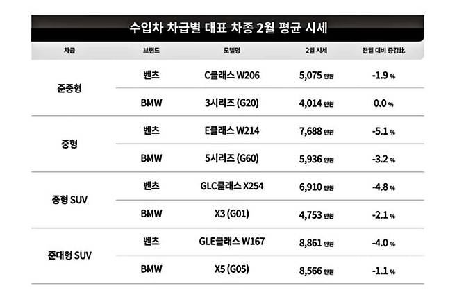 수입차의 경우 지난달과 동일하게 평균 1.7% 하락할 것으로 예상된다. 특히 메르세데스-벤츠와 BMW의 플래그십 모델은 신형 모델의 하락 폭이 구형보다 큰 것으로 나타났다.