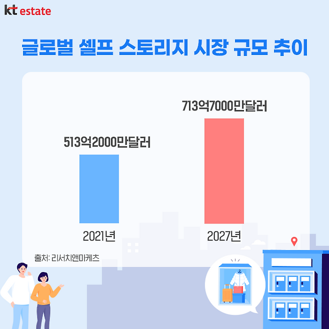 셀프 스토리지는 그동안 유럽이나 미국, 일본 등지에서 빠르게 확장되고 있었는데요. 특히 미국은 2018년 기준으로 전체 가구의 약 9.4%가 셀프 스토리지를 이용하며, 총매출액은 약 395억달러(한화 약 50조원)를 기록할 정도입니다. 또한, 글로벌 리서치 업체인 리서치앤마케츠에 따르면 글로벌 셀프 스토리지 시장은 2021년 513억2000만달러(한화 약 66조6700억원) 2027년 713억7000만달러(한화 약 92조7500억원)로 성장할 것이라고 전망했습니다.