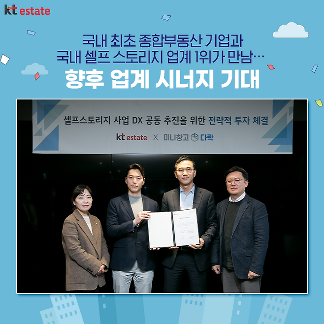이번 협약은 국내 최초 종합부동산 기업과 국내 셀프 스토리지 업계 1위의 만남으로 화제가 되기도 했는데요. 해당 협약을 통해 KT에스테이트는 세컨신드롬 최초의 전략적 투자자로써 기업 가치를 성장시키고, KT 그룹의 인프라와 ICT 기술력을 세컨신드롬의 운영 노하우와 접목해 ‘DX형 셀프 스토리지’ 사업을 전개할 계획이라 밝혔습니다.
