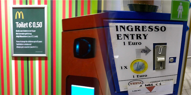유럽에서는 주요 관광지나 휴게소에 있는 공공 화장실에서도 돈을 받는데요. 가격도 천차만별이지만, 일부 화장실의 이용료는 무려 1.5유로, 약 2천원이나 받습니다. 하루에도 여러 번 화장실을 가야 하므로 결코 만만히 볼만한 가격은 아니죠.