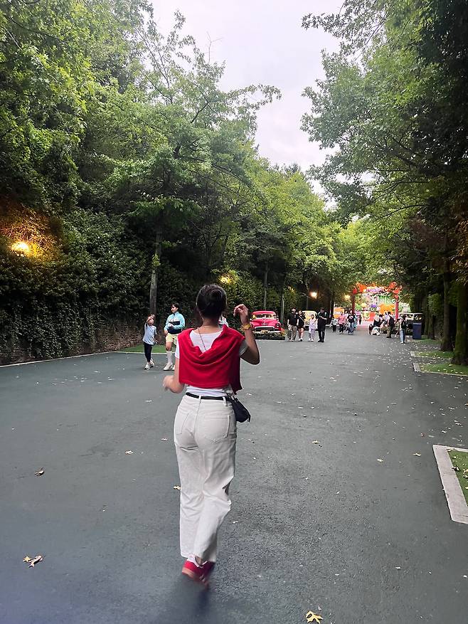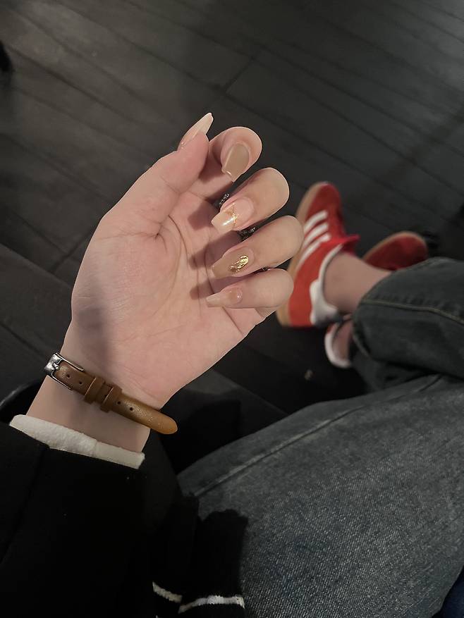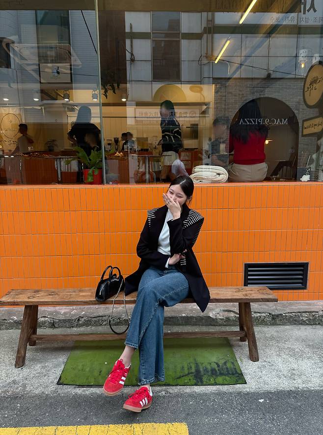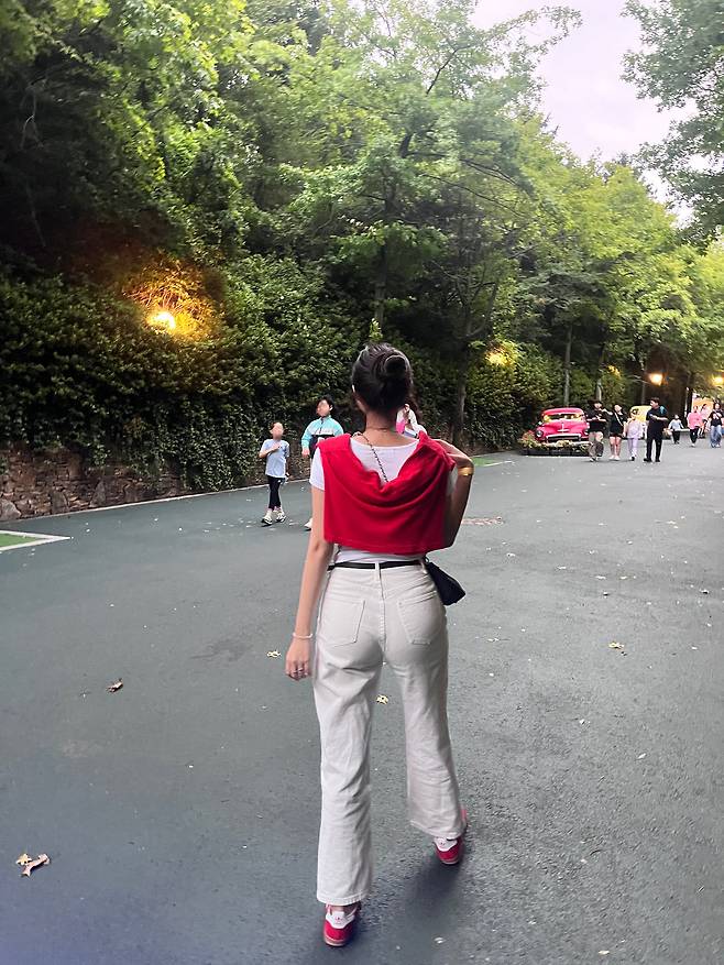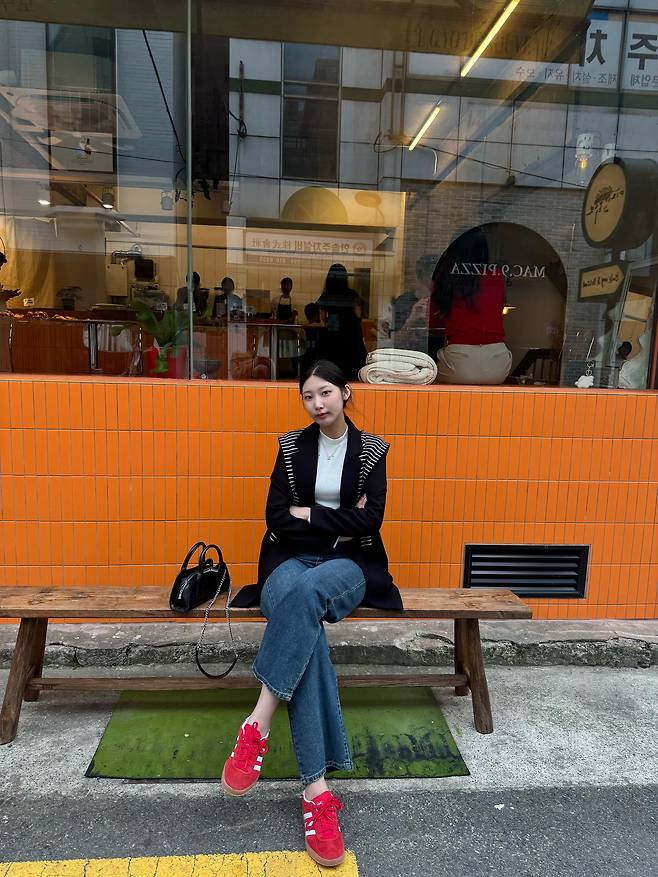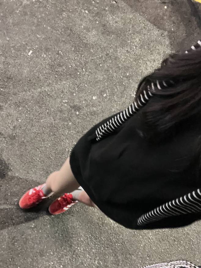 조금 심심한 느낌이 강해서 레드컬러 스니커즈를 신어줬더니 포인트로 너무 예쁘지 않나요 ㅎ.ㅎ