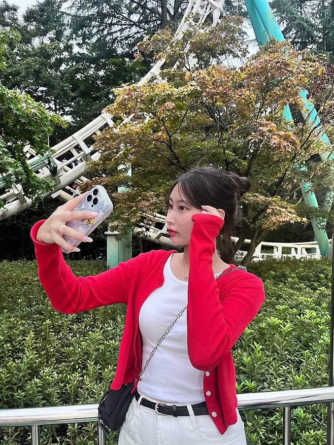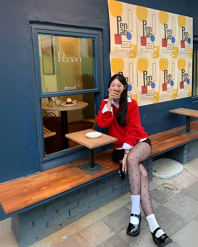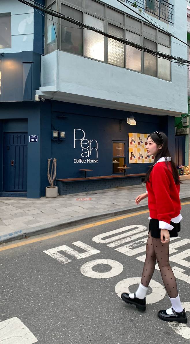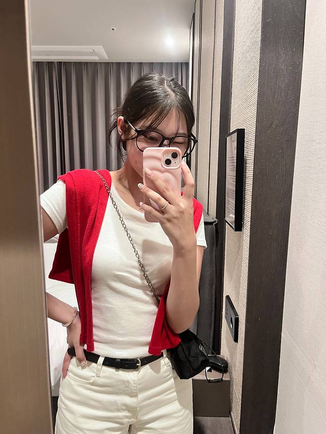 레드 스니커즈, 가디건, 숄, 가방, 스크런치 등으로 포인트를 줄 수 있을 것 같네요!