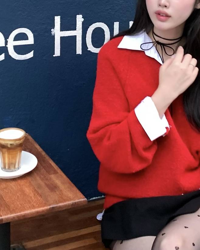 레드 니트를 포인트로 레이어드 해줘 보았는데요.