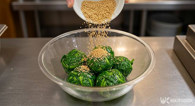 데칠 때는 줄기와 잎을 나눠 넣어야 식감이 살아난다. 찬물 헹굼은 색과 아삭함을 유지하는 데 꼭 필요하다. 통깨는 미리 갈지 말고 마지막에 바로 갈아 넣는 게 좋다. 무칠 때는 비비지 말고 가볍게 털어야 부추가 흐물해지지 않는다.