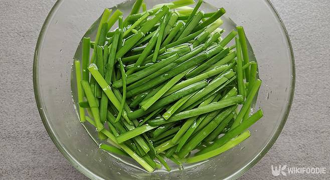 먼저 부추는 흐르는 물에 깨끗이 씻는다. 이후 7cm 길이로 썰어준다. 얇은 꼬리 부분은 길게 남겨두는 것이 좋다. 데치면 쉽게 무르기 때문이다.