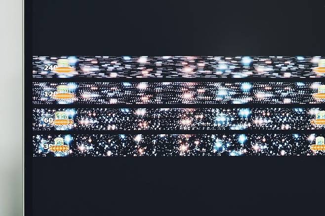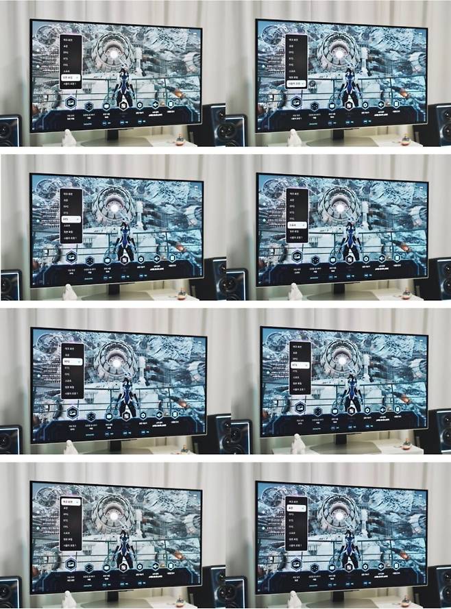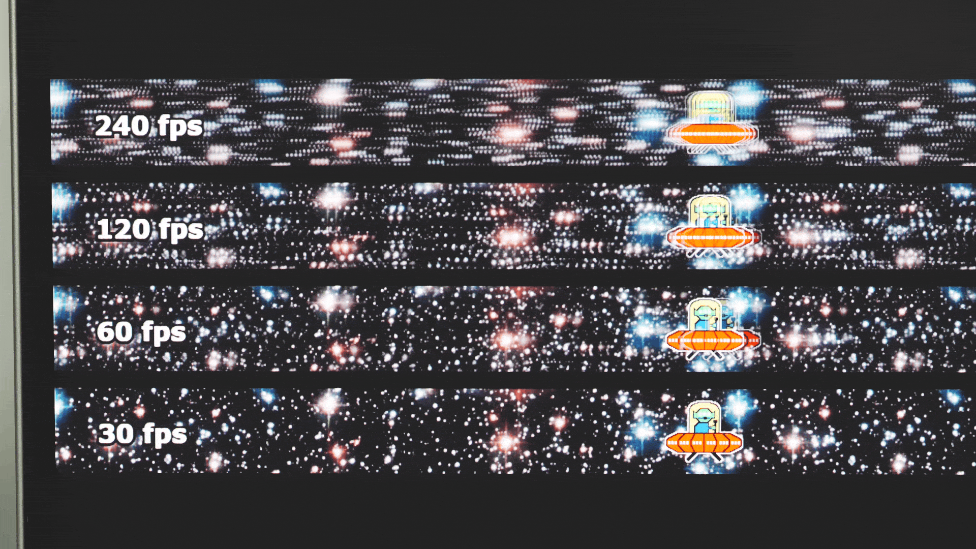 가장 먼저 게이밍 모니터에서 중요한 점은 '주사율'일 것입니다. 최대 240Hz의 주사율은 굉장히 부드러운 화면을 체감할 수 있게 해주는데요, 사진에서와 같이 120, 60과 같은 낮은 프레임에서는 피사체가 몇개 보이지 않아 사진을 이어놓은 느낌이 강하다면, 240Hz의 고주사율에서는 미세하게 우주선이 겹쳐있어 가장 영상과 같은 느낌을 주고 있습니다.