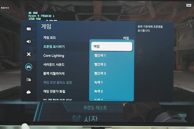 게이밍 모니터의 기능 중 빠질 수 없는 기능은 바로 '에임 보정'이라고 불리우는 '조준선 기능'일 것입니다. 화면 중앙에 고정적으로 조준선을 표시하여 인게임에서 다른 환경 색감과의 교차로 인해 잘 보이지 않는 조준선을 보정해준다라고 보시면 되는데요, 조준점은 빨간색 3개, 녹색 3개로 제공되며, 위치를 따로 변경할 수도 있어서 개인의 취향에 따라 사용할 수 있습니다.