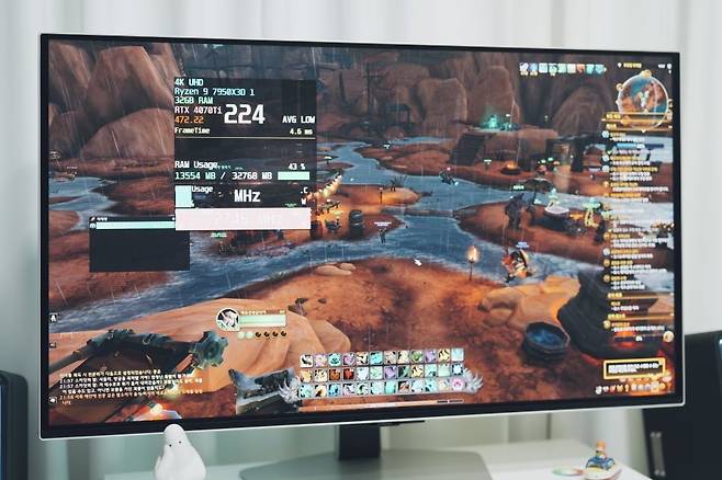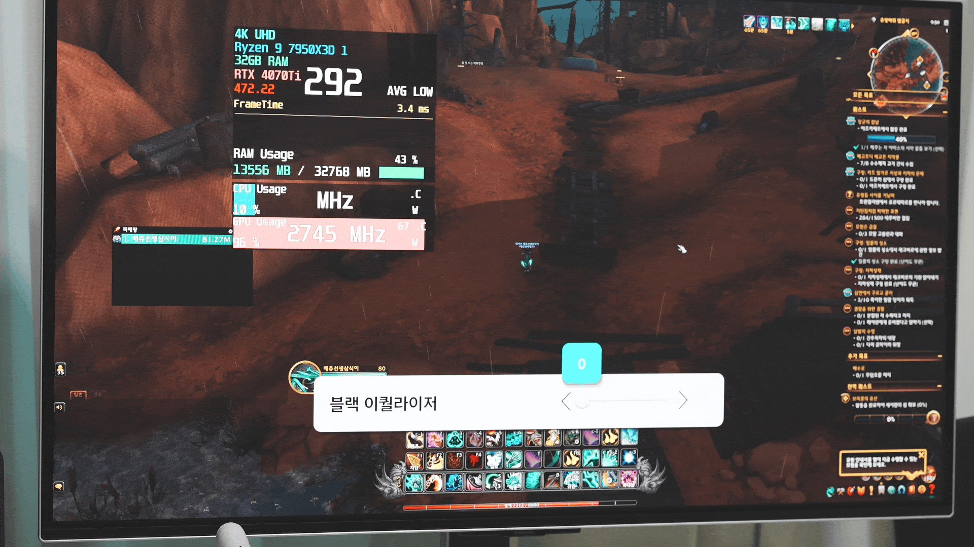 스페이스 마린 2나 헬다이버즈2와 같은 트리플 A 게임에서는 4K 해상도의 프레임을 100이상 뽑아내지 못해 그래픽카드 업그레이드가 필요해보이지만 화질과 자연스러운 화면 이동, 그리고 빠른 응답속도는 시스템의 사양을 떠나 체감할 수 밖에 없는 영역이었습니다.