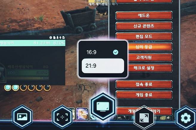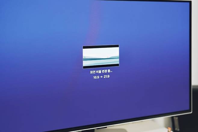 게임 설정에서는 화면비 조절도 가능합니다. 다중 화면비를 지원하는 것이 바로 삼성 오디세이 G8 G80SD의 장점 중 하나일텐데요, 기본적으로 16:9 비율을 지원하지만 와이드 모니터처럼 21:9 비율로도 사용이 가능합니다. 변경하는 시간은 약 10초 이내로 굉장히 빠른 편이며, 단순히 화면을 커팅하는 것이 아닌 더 넓은 시야각으로 볼 수 있게 해줍니다.