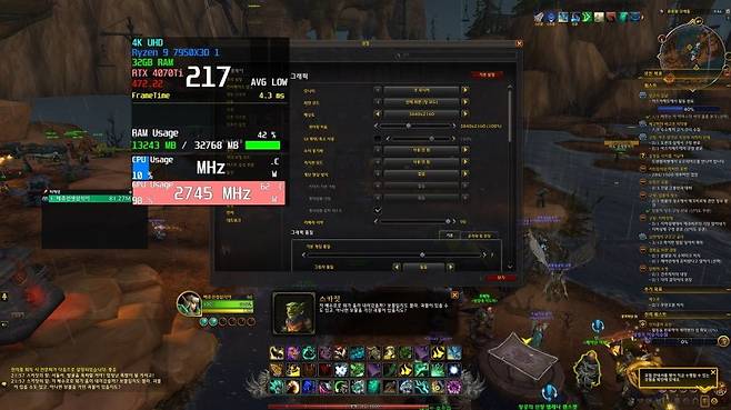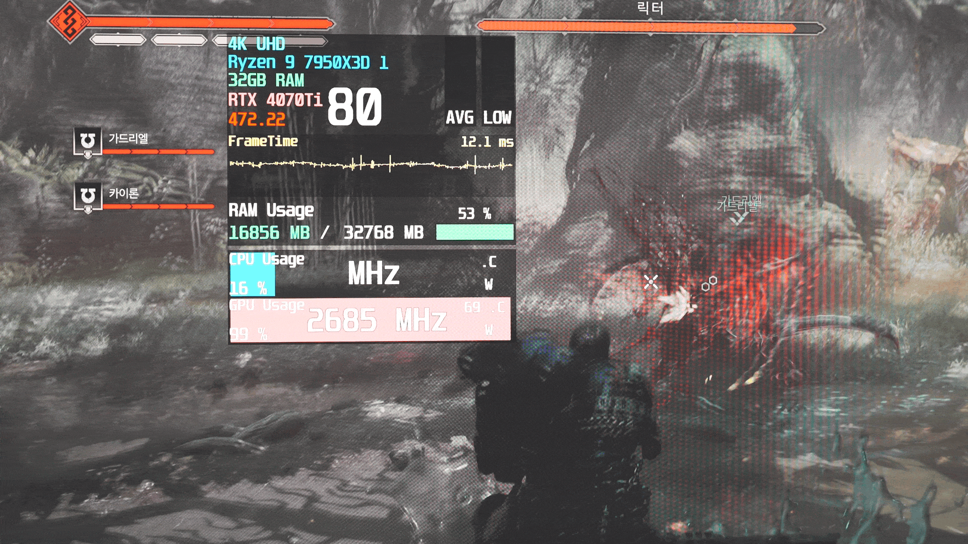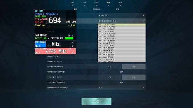 그럼 바로 게임테스트를 진행해보도록 하겠습니다. 테스트는 3840 × 2160의 4K 해상도, 240Hz의 주사율 혹은 수직 동기화를 해제한 상태에서 진행하였고, 시스템 사양은 라이젠 9 7950X3D에 RTX 4070Ti를 기반으로 한 중고급형 시스템을 사용하였습니다.