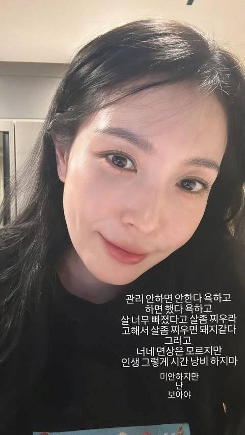 이에 보아는 지난달 자신의 SNS에 "관리 안 하면 안 한다고 욕하고, 하면 했다 욕하고. 살 너무 빠졌다고 살 좀 찌우라고 해서 살 좀 찌우면 돼지같다 그러고. 그렇게 시간 낭비하지 마"라며 악플러들에게 일침을 가했다.