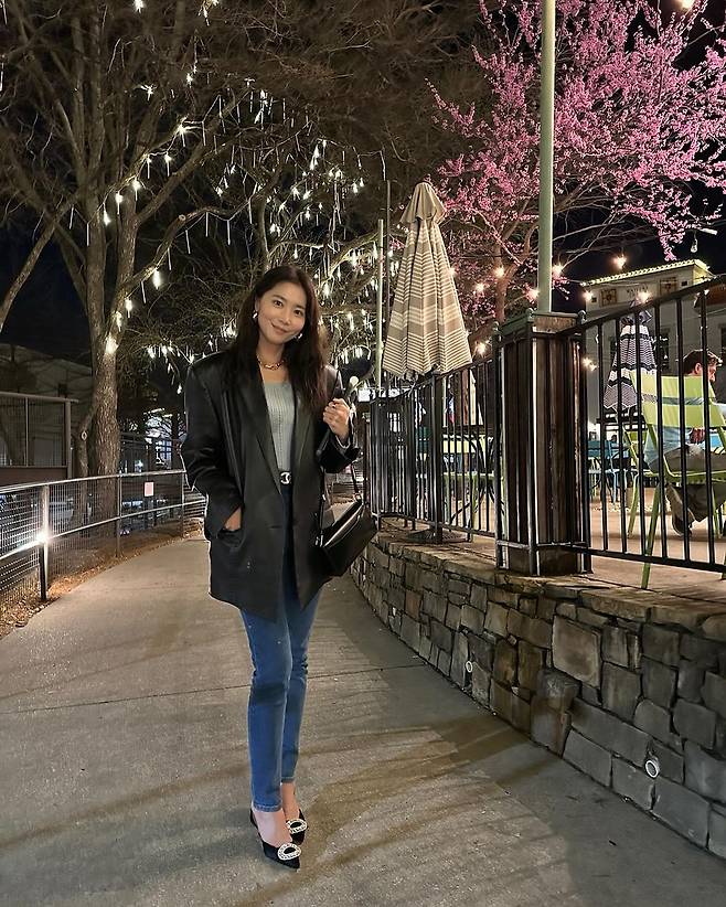 사진 속 오윤아는 그레이 티를 이너로 입고 블랙 가죽 자켓과 스키니한 청바지를 입고 블랙 힐을 신어 날씬한 기럭지를 자랑했다.