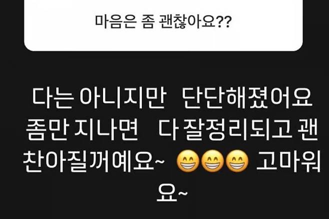 최정원은 SNS를 통해 팬들과 '무물'을 주고받으며 "단단해졌다. 좀만 지나면 다 정리되고 괜찮아질 거다"라며 현재 상태를 전했습니다.