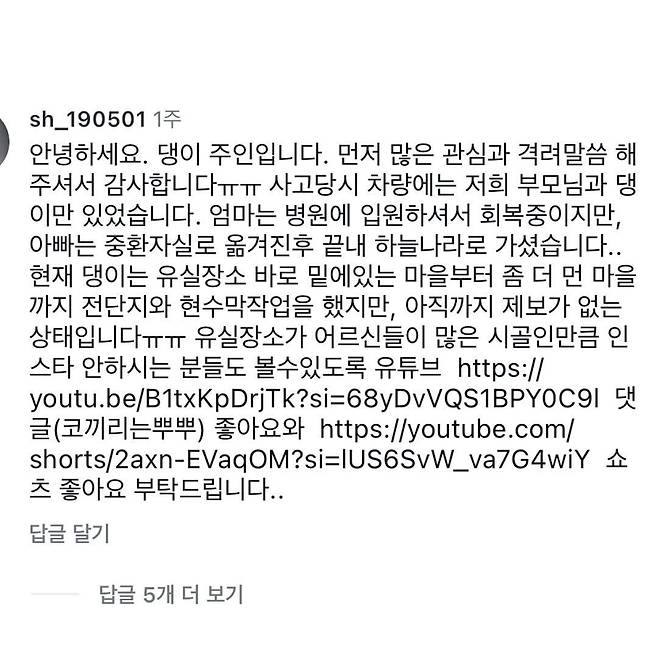 지해피독에 따르면 지난해 12월 17일 A씨의 부모님과 트럭을 타고 가던 댕이는 경북 상주시 속리산휴게소(청주 방향) 5㎞ 지점에서 교통사고가 나며 실종되었습니다. A씨의 어머니는 병원에 입원해 회복하고 있지만 안타깝게도 아버지는 중환자실로 옮겨진 후 끝내 숨진 것으로 알려졌습니다.