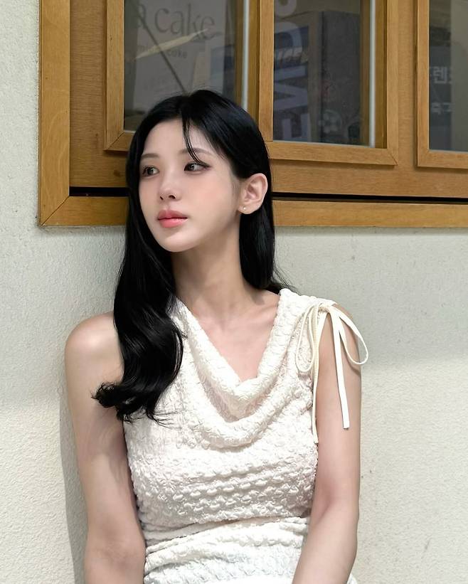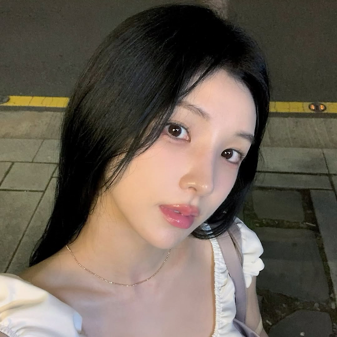 어깨 라인이 비대칭으로 드러나는 드레이프 드레스는 강다은의 쇄골과 팔선을 돋보이게 만들며, 전체적으로 우아한 실루엣을 완성한다.