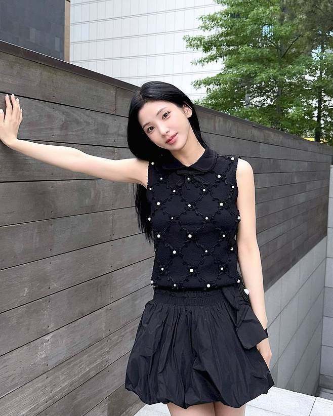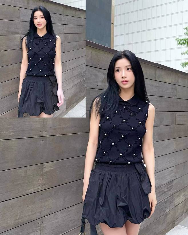 상의는 진주 장식이 수놓아진 블랙 니트 민소매. 베이직한 실루엣이지만 텍스처와 포인트가 강해 따로 액세서리 없이도 완결감이 있다.
