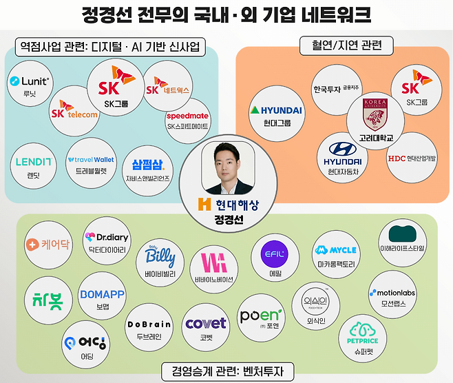 정 전무는 시니어 헬스케어 플랫폼을 운영하는 스타트업 ‘케어닥’과 자동차 구매·판매·관리 등 종합 모빌리티 플랫폼을 운영하는 ‘차봇’에도 각각 20억원을 투자했다. 두 기업의 주력사업 자체가 자동차 보험 상품을 판매하는 현대해상과의 업무 관련성이 높은 만큼 각종 업무 협약을 사업적 협력관계도 유지하고 있다. 케어닥은 간병인 지원 특약, 노인성 질환 보험 관련 신상품 공동연구를 차봇은 자동차 사고 보상 서비스와 긴급출동 서비스 등의 사업을 함께 진행 중이다.