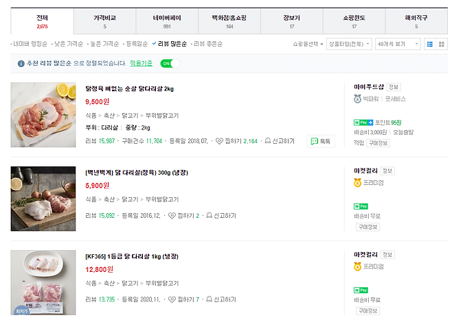 그냥 네이버 쇼핑에서 앞다리살, 닭다리살, 고등어 등등 검색해서