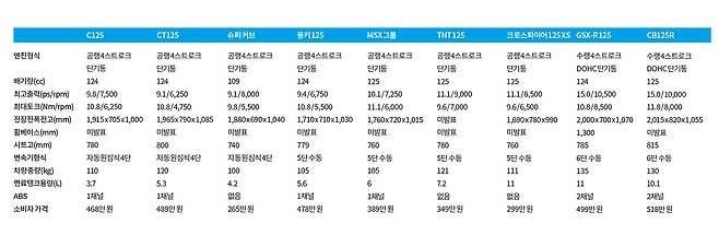 미국 원주민들 사이에 전해져 오는 말 중에 ‘안장에 익숙해졌을 때, 비로소 자유를 느낄 수 있다.’라는 말이 있다. 바이크도 마찬가지라고 생각한다. 배기량이 크면 클수록 타는 법을 익히고 조작에 익숙해지는 데 시간이 오래 걸리기 때문에 타는 즐거움에 집중하지 못할 수 있다. 주행이 익숙해지고 나면 출력에 부족함을 느낄 수 있는데, 그건 그때 가서 고민할 일이다. 입문으로 탔던 125cc 모터사이클로부터 새로운 종류의 자유로움과 설렘으로 가득한 추억을 얻었다. 나에게 꼭 맞는 125cc 모터사이클을 선택하는 것부터가 그 즐거운 추억의 시작이다. 모터사이클이 익숙한 라이더는 낮은 시트고에서 오히려 자세와 시야 측면에서 불편함을 느낄 테지만 이번 기획은 입문자들을 위한 125cc 모터사이클 소개이기 때문에 입문자의 눈높이에 맞췄다. 시작하는 단계에서는 발이 잘 닿고, 무게가 가벼운 편이 다루기 쉽기 때문에 높은 점수를 주었다. 최대출력과 토크, 연비, 연료탱크의 용량 점수는 해당 항목에서 동급 중 가장 수치가 높은 바이크를 기준으로 백분위 비율로 점수를 매겼다. 시트고와 중량, 가격은 표준편차를 고려하여 점수를 매겼다.